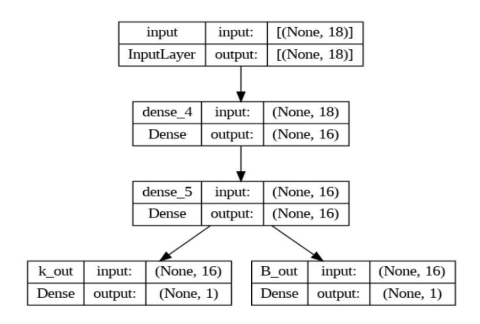 После входа идут два полносвязанных слоя нейросети, в каждом из которых по 16 нейронов, у каждого на выходе функция активации ReLu, а далее – два выходных нейрона – один оценивает параметр k гамма-потока, а второй - размер пачки B. У выходных нейронов функция активации отсутствует. Это одна из типичных архитектур нейросети для решения задачи регрессии параметров входных данных.