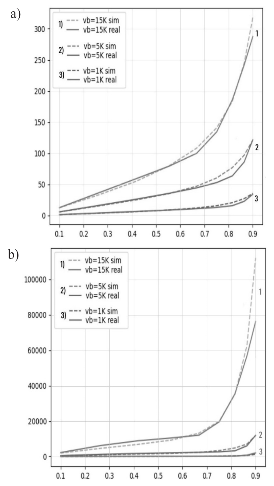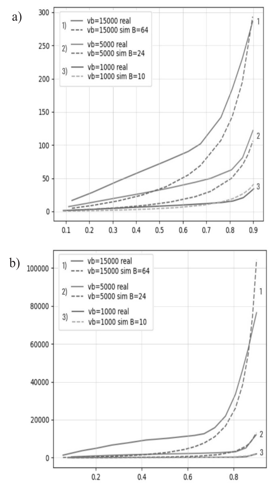 Имея значения и статистических характеристик очереди реального трафика и , мы можем методом наименьших квадратов минимизировать по параметру B отклонение аналитических кривых (1), (2) от реальных значений при соответствующих нагрузках, и это даст нам приближение реального трафика групповым пуассоновским потоком в смысле порождаемой очереди. Заметим, что в описанных ниже экспериментах мы использовали метод наименьших взвешенных квадратов с весами, обратно пропорциональными значениям соответствующих и , так как они сильно различаются по величине. То есть, по параметру B минимизировалась следующая величина: