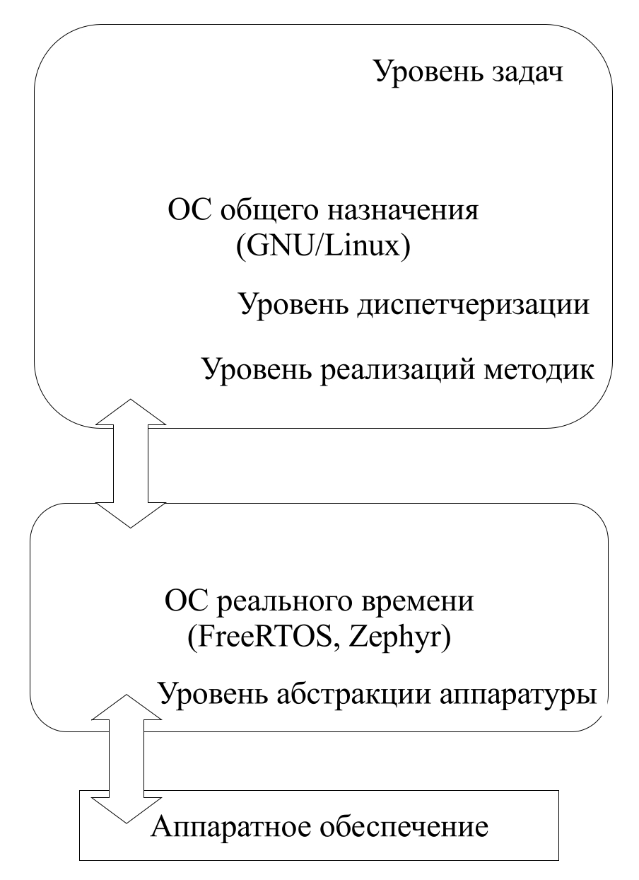 Реализация данного каркаса для системы управления роботами-манипуляторами может быть выполнена на базе кластера из вычислительных устройств, причем важную роль в организации такого кластера будут играть правильно подобранные компоненты в виде операционных систем и средств взаимодействия внутри кластера. На рисунке 2 представлен возможный вариант распределения уровней архитектуры каркаса методик управления.
