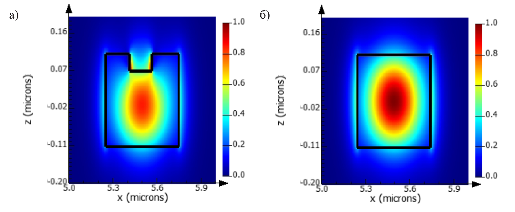 Рисунок 1. Распределение мощности в кольцевом волноводе шириной 400 нм: а) в центре отверстия; б) между отверстиями.