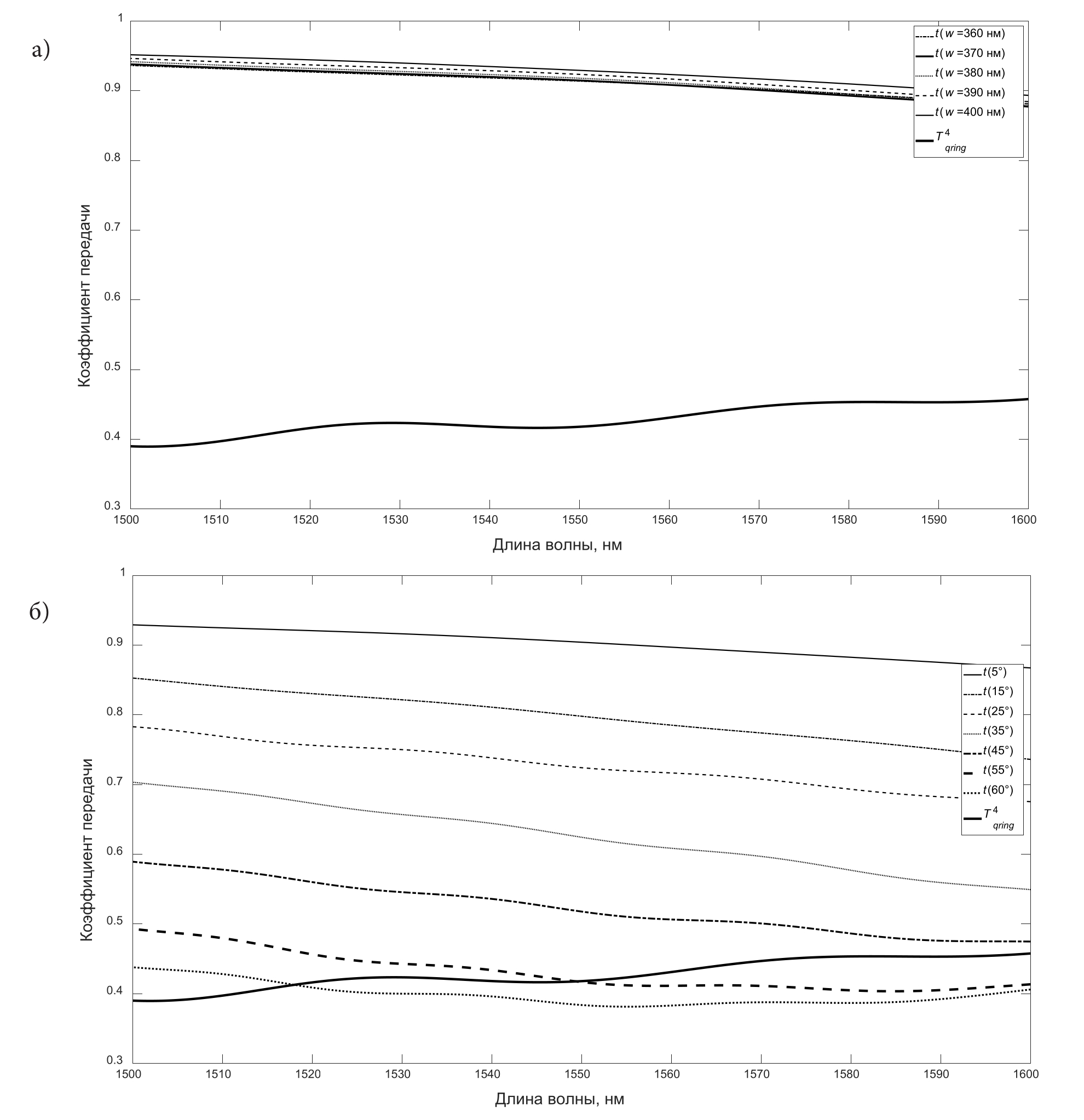 В работе [17], мы оптимизировали параметры излучающего МКР с шириной кольцевого волновода 400 нм следующим образом: ширина подводящего волновода , угол изгиба подводящего волновода в схеме «pulley-coupling» Θ = 20° [19] (обозначим его МКР_1). Далее, используя тот же алгоритм, мы оптимизировали МКР_2 при ширине кольцевого волновода 500 нм. Для определения величины потерь во всем кольцевом волноводе была использована методика, описанная в работе [4]. Чтобы определить амплитудный коэффициент передачи кольцевого волновода мы моделируем ¼ часть кольца , а затем полученное значение возводим в четвертую степень.
