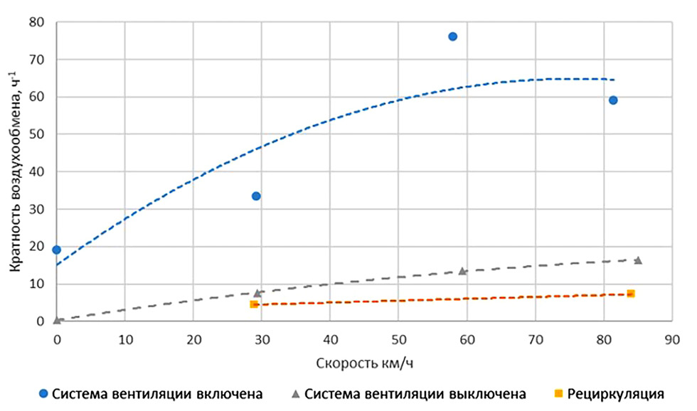 Для выключенной системы вентиляции кратность воздухообмена составила 0,42; 7,57; 13,47; 16,4 ч-1 для движения ТС со скоростями 0; 29,3; 59,2 и 85 км/ч соответственно.