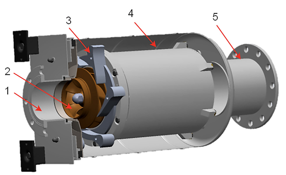 Проточная часть погружного насоса вертикальной компоновки имеет: входной патрубок – 1, рабочее колесо консольного расположения с пространственной лопастной системой – 2, направляющий аппарат лопаточного типа – 3, кольцевую камеру корпуса – 4, напорный патрубок – 5.
