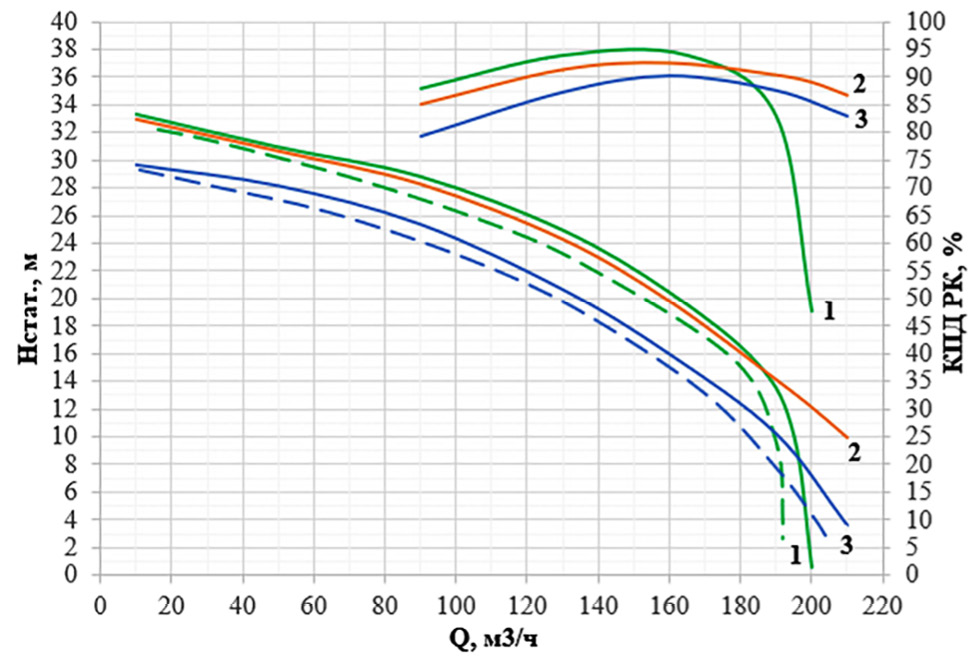 Рис. 2. Напорные и энергетические характеристики насоса при различных диаметрах входа в РК: 1 – D0 /D2=0,62; 2 – D0 /D2=0,66; 3 – D0/D2=0,78; сплошная линия – расчет; пунктирная – эксперимент.