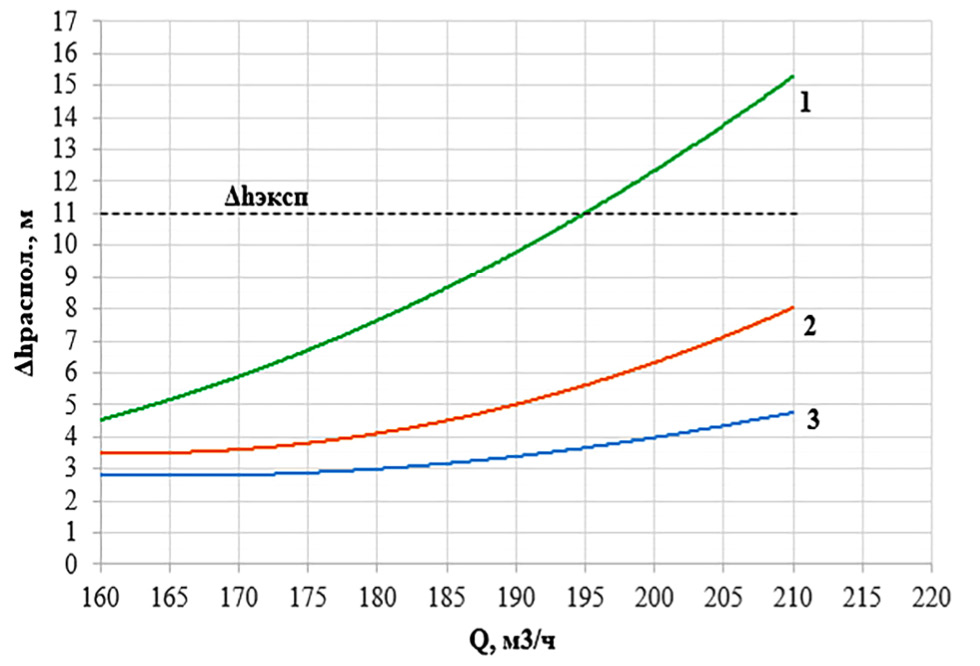 Fig. 3. The simulated overall cavitation curves for various impeller inlet diameters: 1 – D0 /D2=0.62; 2 – D0 /D2=0.66; 3 – D0 /D2=0.78; Δhexp is the distance between free surface and the pump inlet in the experiment.