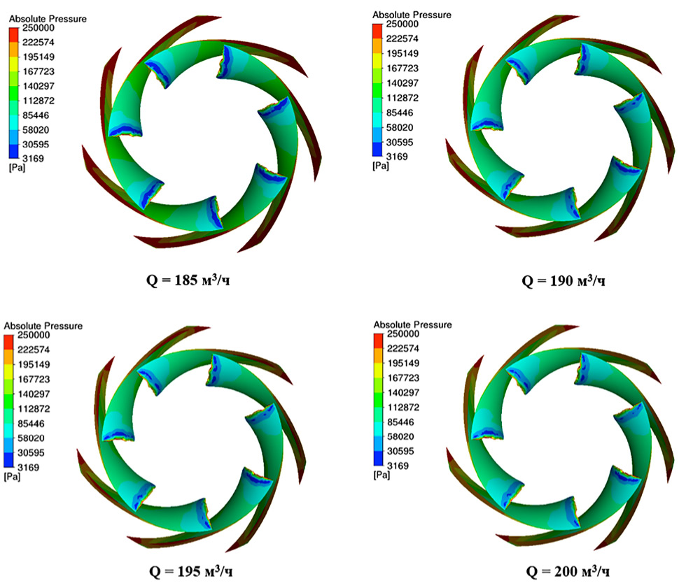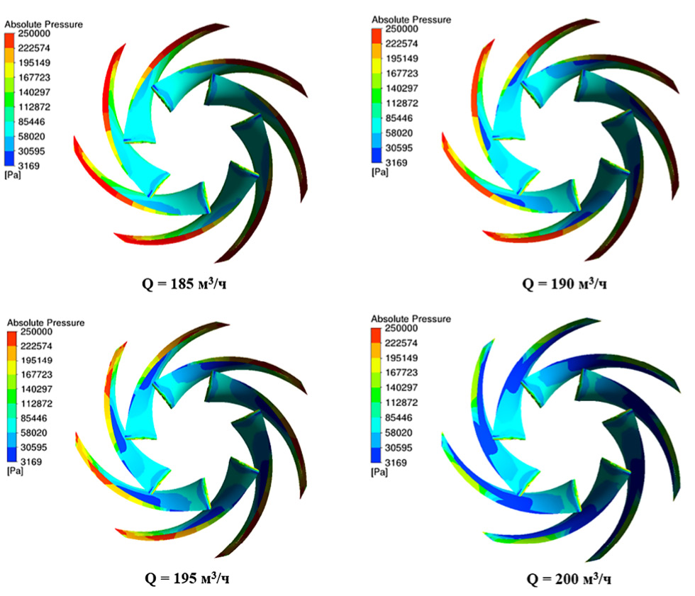 При безразмерном диаметре входа в рабочее колесо D0 /D2=0,78 на режимах Q ≥185 м3/ч (Q/Qном ≥1,16) на задней стороне лопасти рабочего колеса обширная зона пониженного давления отсутствует, за исключением входной кромки (см. рис. 5). При таких величинах абсолютного давления на задней стороне лопасти в рабочем колесе, кавитационный срыв напорной и энергетической характеристик не происходит, а вид характеристик – не западающий (см. рис. 2). Таким образом, увеличение диаметра входа рабочего колеса позволило обеспечить бескавитационную работу на режимах больших подач.