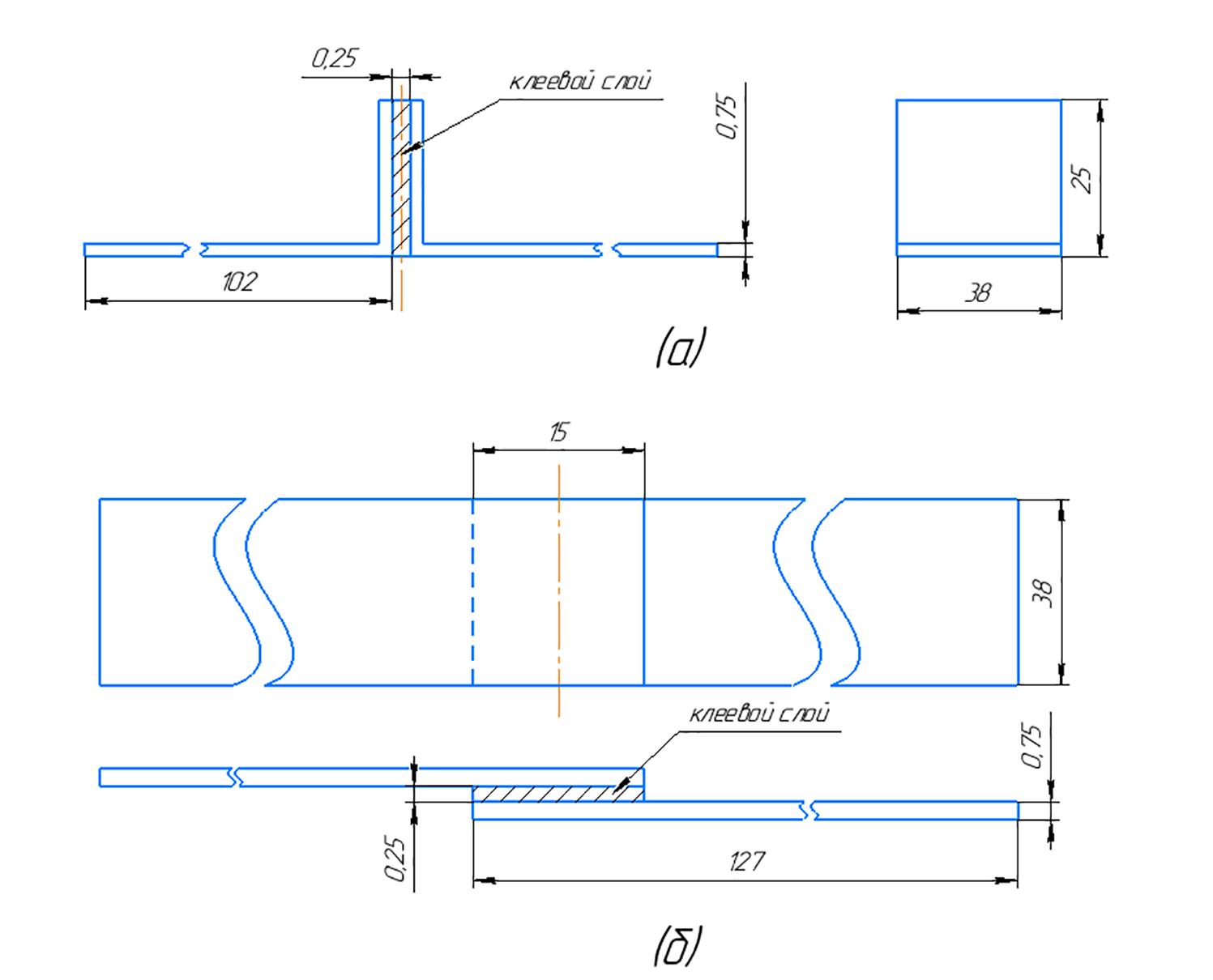 Проведены эксперименты при сдвиге для исследования разрушения клеевого материала в соединении «внахлест». Размер образца клеевого соединения показан на рис. 3