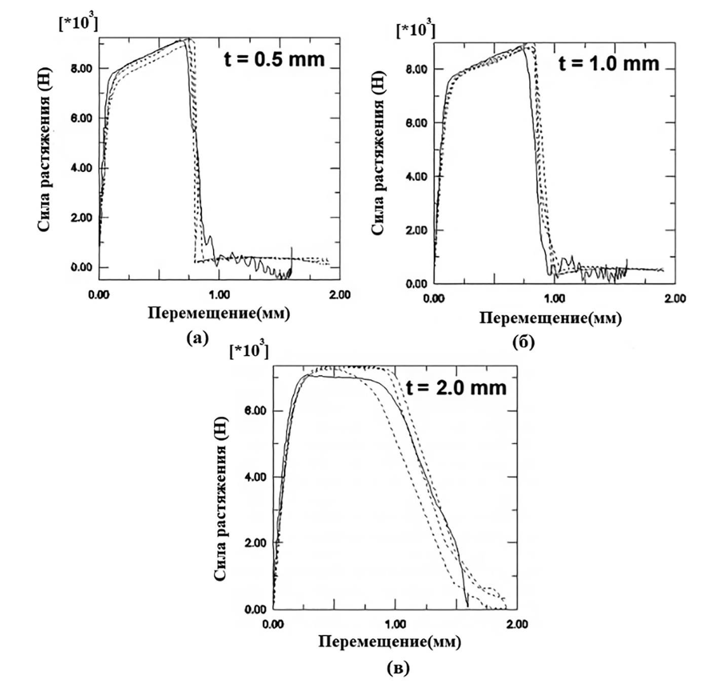 Рис. 4. Графики зависимости «сила–перемещение» для соединения «внахлест» при квазистатическом нагружении