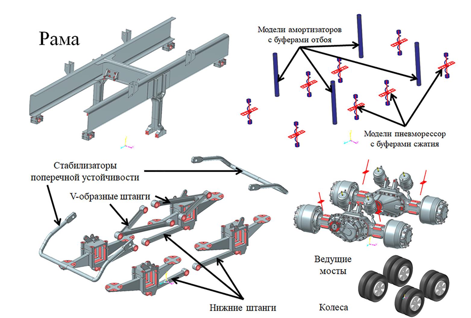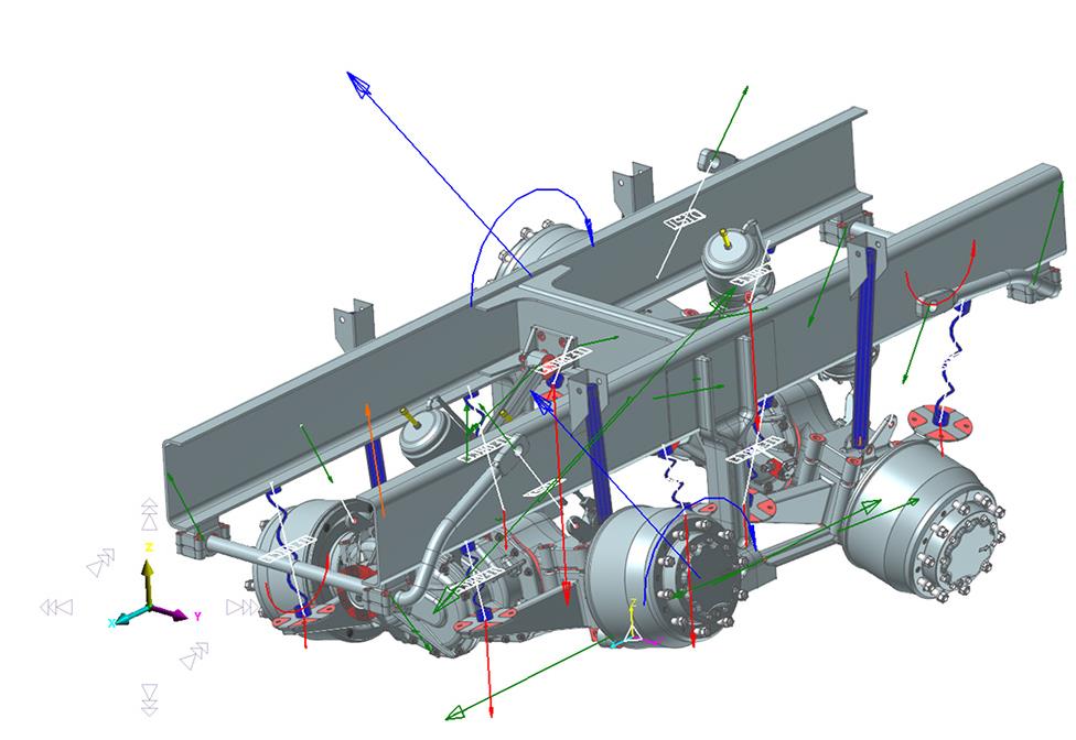 Для расчета нагрузок в деталях подвески для всех возможных положений колес автомобиля при проектировании разработана модель виртуального стенда в среде на основе решения уравнений динамики твердых тел [8]. С помощью разработанного стенда можно проводить исследования нагружения деталей в различных расчетных режимах и выявлять максимально возможные нагрузки для всех деталей и шарниров конструкции. Такие исследования позволяют на первоначальных этапах проектирования выявлять опасные нагрузочные режимы без проведения дорогостоящих натурных испытаний. Полученные нагрузки могут быть использованы для проведения прочностных расчетов методом конечных элементов или для подбора необходимых компонентов.