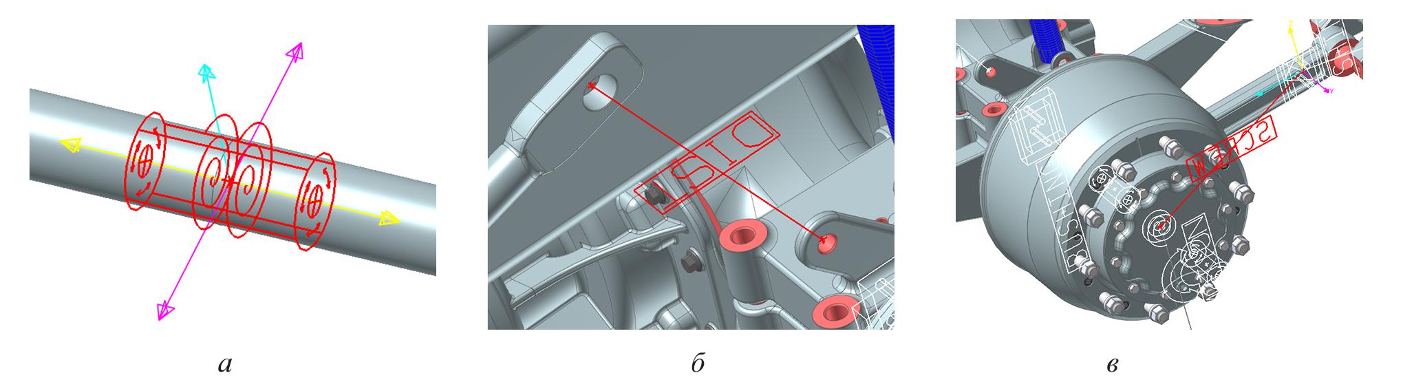 Соединение стабилизаторов поперечной устойчивости с кронштейнами мостов организовано шарнирами (DISTANCE) [9] (рис. 5,б), моделирующими постоянное расстояние между двумя маркерами на соединяемых звеньях в течение всего процесса моделирования. Данный шарнир передает только силу в направлении между двумя заданными параметрическими точками на соединяемых звеньях.