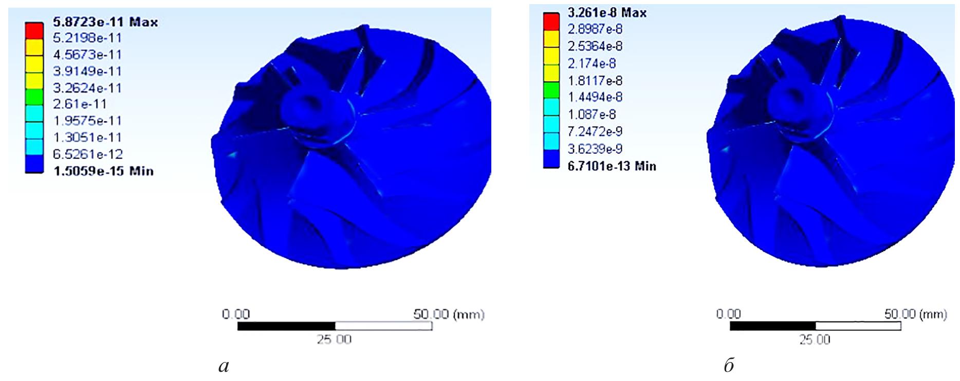 Fig. 14. Equivalent deformation: а – structural steel wheel; b – nickel alloy wheel
