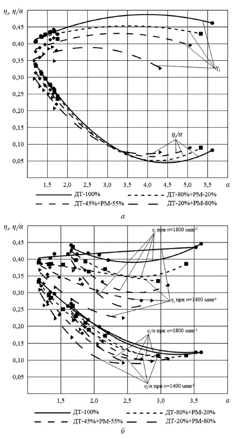 В ранее проведенных стендовых испытаниях тракторного дизеля Д-245.5С, размерностью 4ЧН 11,0/12,5 [14, 15], согласно ГОСТ [7], были получены внешняя скоростная и две нагрузочные характеристики при n = 1800 мин-1 и n = 1400 мин-1, соответствующие номинальной мощности и максимальному крутящему моменту на следующих составах СТ: ДТ-80%+РМ-20%, ДТ-45%+РМ-55%, ДТ-20%+РМ-80%, а также на чистом ДТ. В результате были определены эффективные показатели указанного дизеля в зависимости от n и pe. При проведении испытаний была произведена перерегулировка ТНВД путем изменения активного хода плунжера с целью увеличения для компенсации снижения количества теплоты, вносимой с СТ в дизель, на величину, равную [13−16]. При обработке экспериментальных данных абсолютная погрешность измерений, определенная согласно [7], составила 2%, что, в свою очередь, свидетельствует о достоверности полученных показателей [13−15].