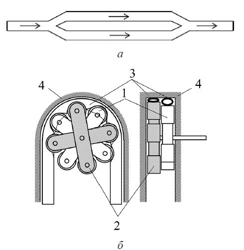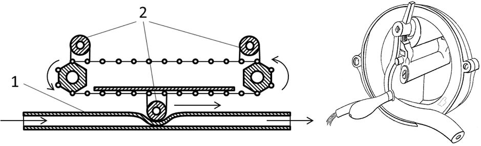 Первые перистальтические насосы [2, 3] представляли собой конструкции, показанные на рис. 1. В конструкции с линейно расположенным рабочим органом использовалась роликовая цепь, которая перемещала выжимные элементы насоса. В конструкции с расположенным по кругу шлангом использовался всего один выжимной элемент, который имеет довольно сложное строение и приводится в движение вручную.