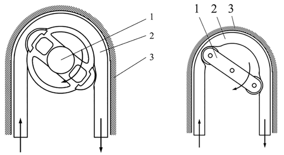 Рис. 2. Наиболее распространенные в настоящее время конструкции перистальтических насосов: а) с башмаками в качестве выжимных элементов; б) с роликами в качестве выжимных элементов; 1 – ротор с выжимными элементами; 2 – упругий рабочий орган; 3 – корпус