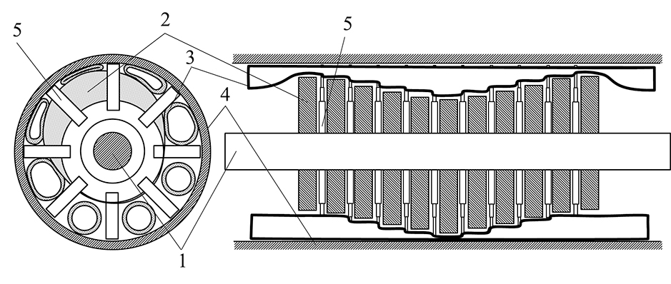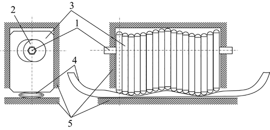 Рис. 4. Перистальтический насос с линейно расположенным упругим рабочим органом и толкателями: 1 – вал; 2 – эксцентрики; 3 – толкатели; 4 – упругий рабочий орган (трубка); 5 – корпус