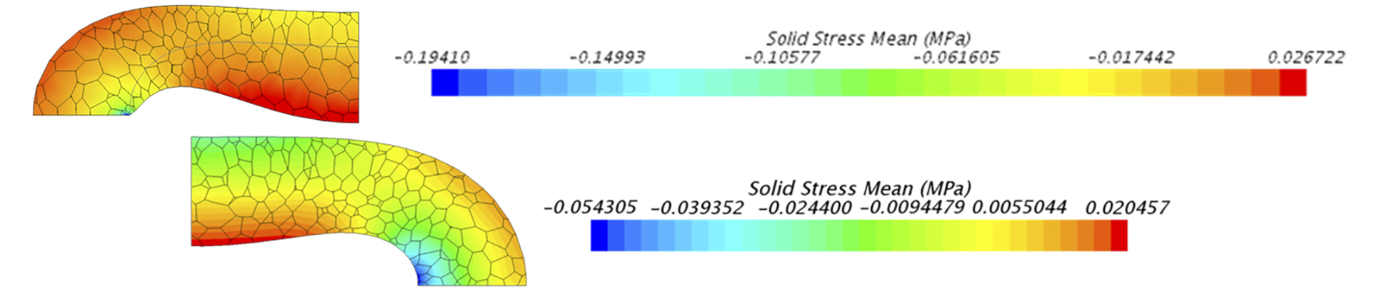 Автором работы [9] проведены исследования по повышению эффективности эксплуатации перистальтического насоса с линейно расположенным упругим рабочим органом и установлено, что использование выступов специальной формы в области сжатия в совокупности с неполным сжатием рабочего органа может увеличить полезную мощность вдвое. Эффект достигается благодаря тому, что выступы в области сжатия рабочего органа первым выжимным элементом уменьшают площадь поперечного сечения и тем самым увеличивают нагнетаемый к выходному патрубку объем жидкости во время срабатывания двух других выжимных элементов. Кроме того, сравнивая напряжения (рис. 5), возникающие при полном сжатии с напряжениями при неполном сжатии из работы [9], а также используя оценку долговечности эластомеров из работы [10], получаем, что неполное сжатие продлевает срок службы упругого рабочего органа в 1,69…2,85 раз (в зависимости от используемого эластомера).