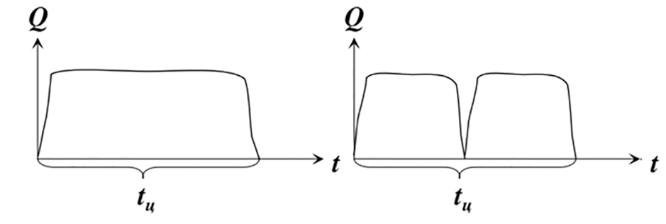 Так же, как и другие виды объемных гидравлических машин, насос перистальтического принципа действия создает неравномерную пульсационную подачу (рис. 6). Этот недостаток препятствует применению перистальтических насосов в тех областях, где требуется не только стерильность, но и постоянство подачи либо ее изменение по некоторому заданному закону. В перистальтических насосах с упругим рабочим органом, расположенным по кругу, неравномерность подачи зависит от количества выжимных элементов [5] – чем их больше, тем более неравномерной получается подача насоса. Неравномерность вызвана промежутками времени, когда ролики входят в контакт с упругим рабочим органом и когда, наоборот, перестают его сжимать.