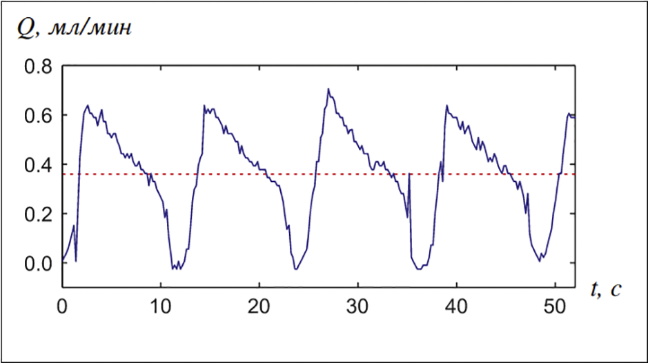 Суммарная подача от двух работающих каналов, функционирующих по предложенной в работе [15] конструкции перистальтического насоса, показана на рис. 11. Применение двух параллельных каналов вместо одного, таким образом, существенно снижает амплитуду пульсаций подачи, но не устраняет их полностью.