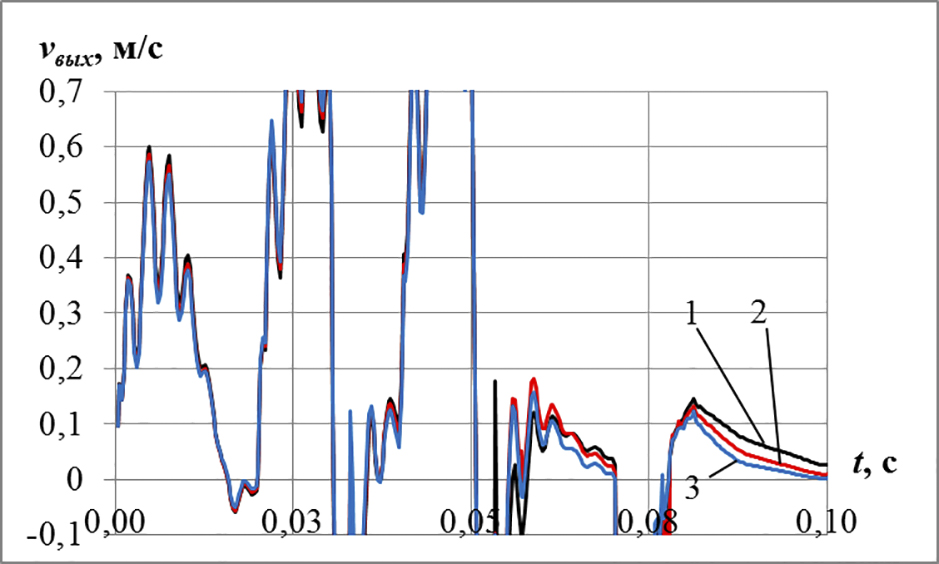 Fig. 8. Velocity pulsations in a miniature peristaltic pump with a linear arrangement of an elastic working body at high operating frequencies of the release elements: 1 – µ=20 mPa·s; 2 – µ=30 mPa·s; 3 – µ=40 mPa·s
