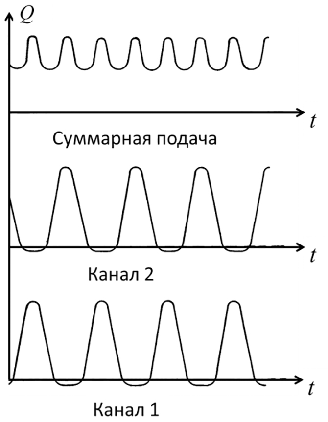 Рис. 11. Подача в каждом отдельном канале и суммарная подача перистальтического насоса с двумя параллельными каналами