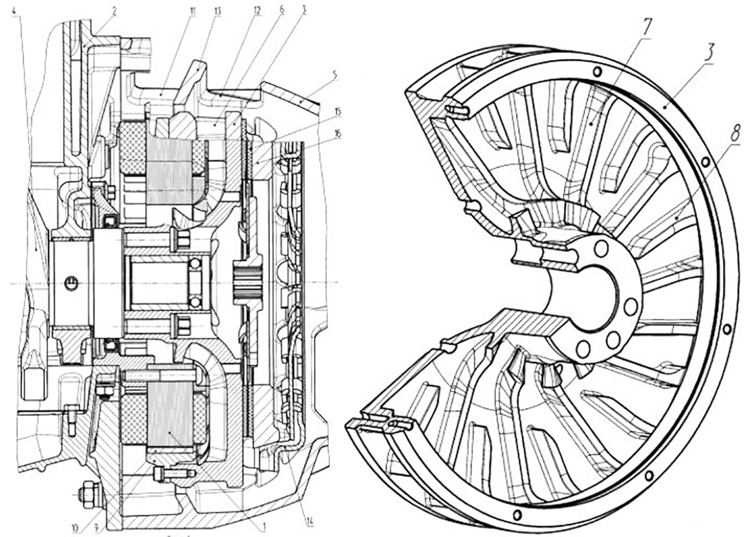 СГУ первоначально разрабатывались как электрические машины с целью снижения массогабаритных показателей и уменьшения количества электрических машин на транспортном средстве. Наибольшее применение СГУ находит на гибридных автомобилях. На рис. 1 представлена конструкция СГУ, представляющая собой обратимую электрическую машину, в состав которой входит статор 1, совмещенный с корпусом ДВС 2, и ротор 3, который механически связан с коленчатым валом 4 при помощи резьбового крепежа. В данной конструкции присутствует кожух 5, который закреплен на корпусе ДВС. Обмотка статора электрической машины подключена к АБ. Ротор представляет собой чашеобразную форму с отверстиями 6, разделенными длинными 7 и короткими 8 лопастями, а вогнутая поверхность ротора с лопастями направлена к статору. Таким образом, при помощи лопастей образуются перегородки окон. Обруч 9 закреплен на роторе и окружает статор, а между ними располагается цилиндрическое кольцо, изготовленное из магнитопласта 10. В кожухе электрической машины расположены вентиляционные отверстия 11 и 12 для охлаждения обмоток.