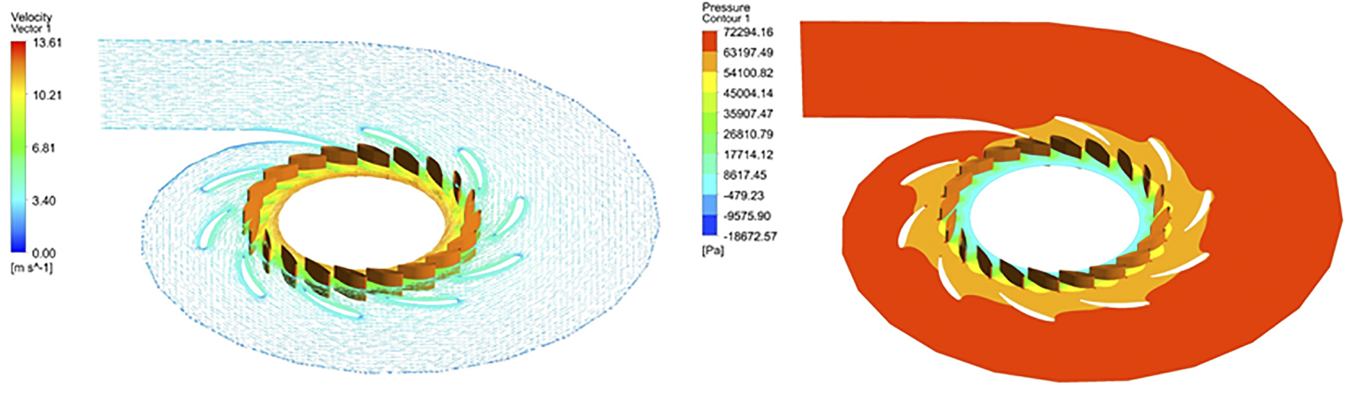 Fig. 2. Velocity and static pressure fields in the volute in turbine mode