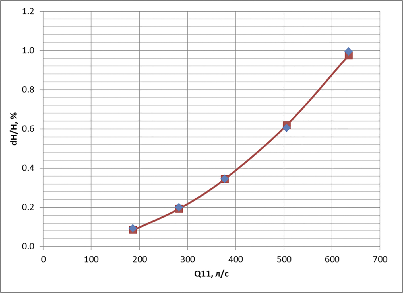 На рис. 3 показано отклонение потерь энергии, полученных в расчете, от аппроксимирующей параболической функции вида h = a·Q112. Как видно, функция достаточно точно описывает характер изменения потерь в спиральной камере. В дальнейших расчетах при определении потерь в спиральной камере в турбинном режиме использовалась полученная зависимость.