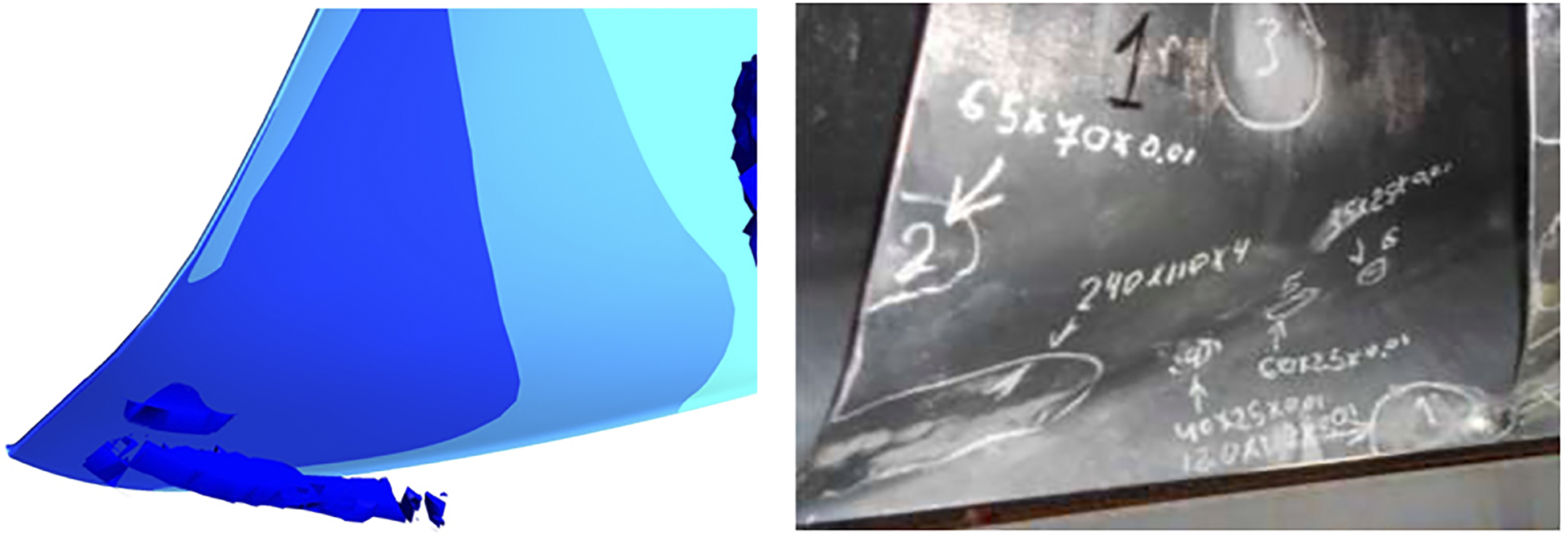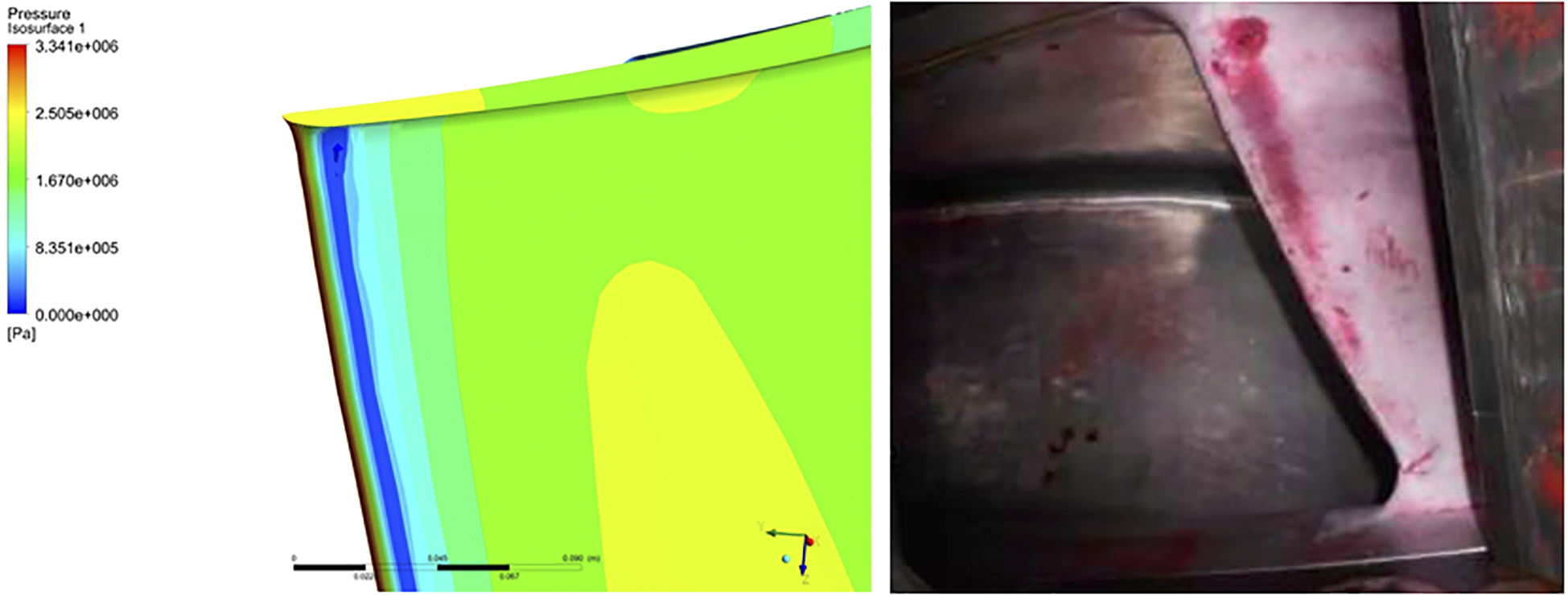 Рис. 5. Сопоставление области возникновения паровой фазы, полученной в расчете, с местами повреждений от воздействия кавитации на напорной кромке рабочего колеса