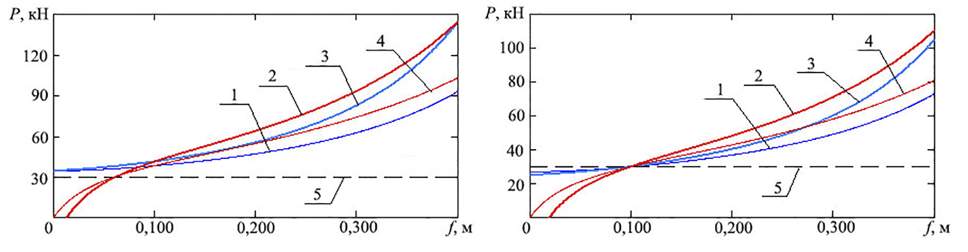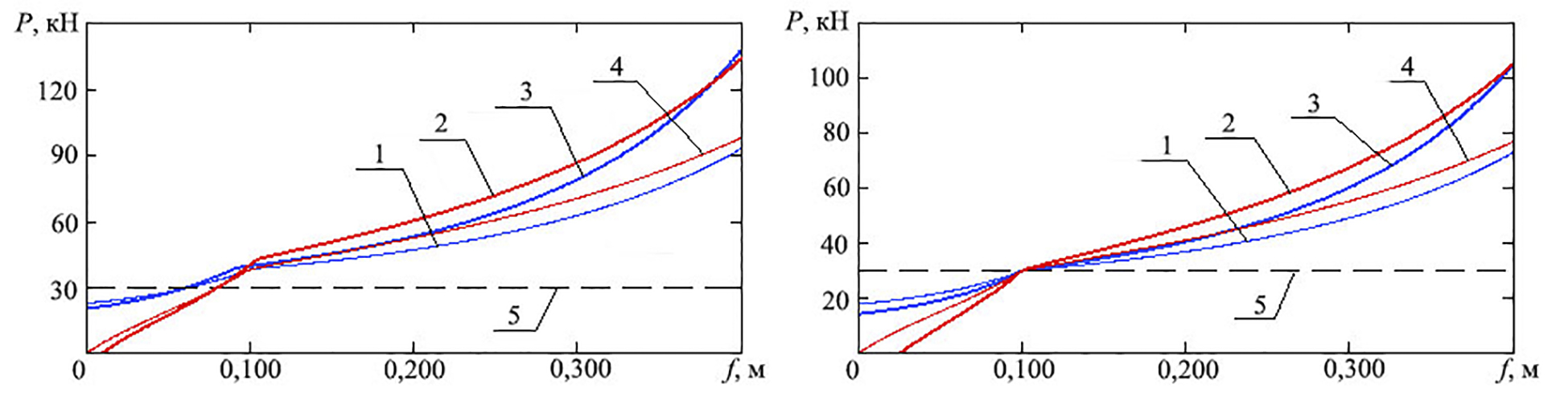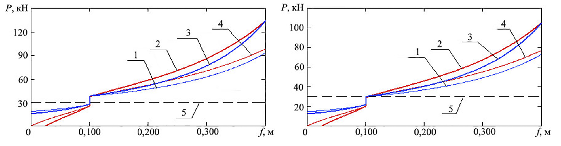 Рис. 1. Статические (1, 4) и динамические (2, 3) характеристики подвески с однокамерной однопоршневой ПГР при рабочей (а) и зарядной (б) температурах: 1, 3 – статическая и динамическая, без противодавления; 4, 2 – статическая и динамическая, с противодавлением; 5 – уровень статической силы