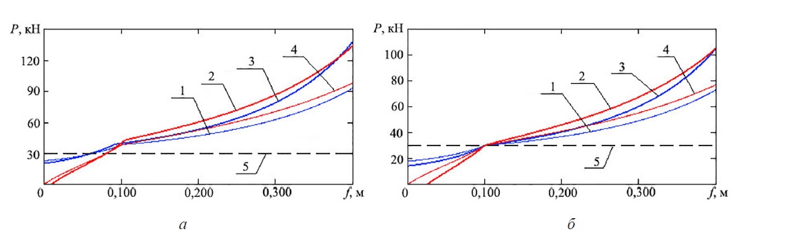 Рис. 4. Статические (1, 4) и динамические (2, 3) характеристики подвески с двухкамерной двухпоршневой ПГР при рабочей (а) и зарядной (б) температурах: 1 – 5 – см. рис. 1
