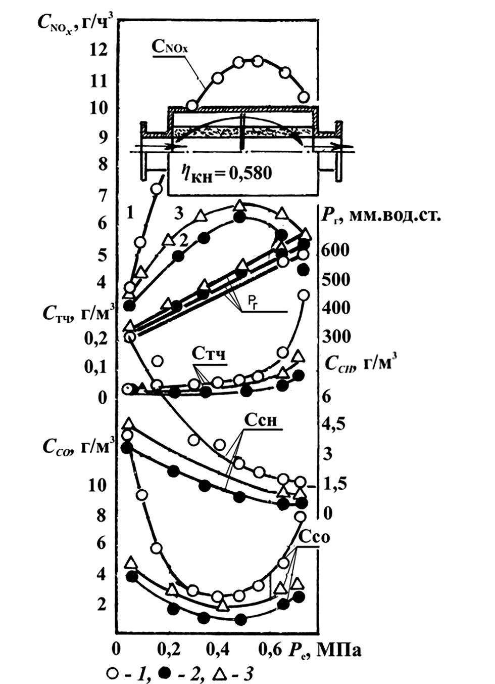 Fig. 1. Test results for the BKN-1 converter with SHS blocks for the KamAZ-740 diesel engine in terms of load characteristics at 2600 min-1: 1 – without CV; 2 – one step; 3 – two steps.