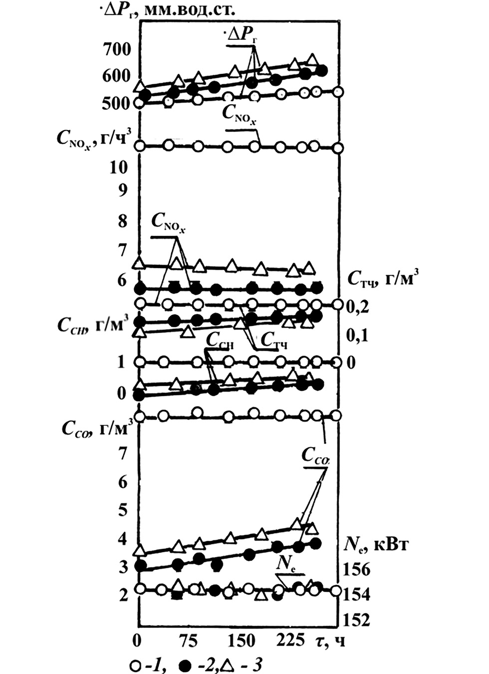 Fig. 2. Efficiency of diesel KamAZ-740 EG conversion: 1 – 280 h, without CV; 2 – 265 h, neutralizer PKN-1; 3 – 260 h, neutralizer BKN-2.