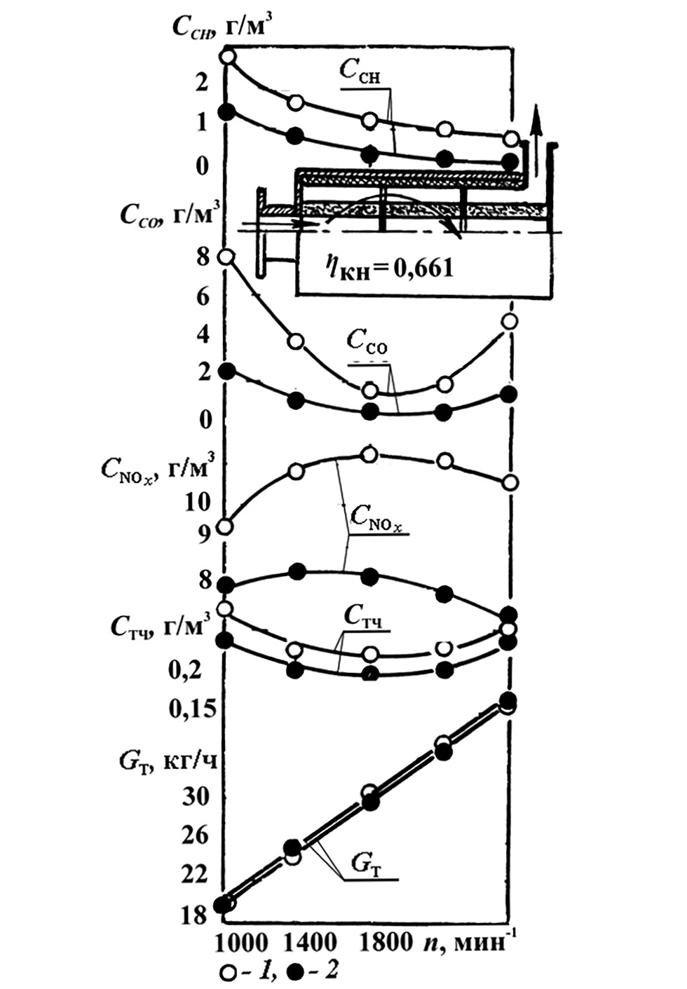 Здесь эффективность восстановления NOх связана с ростом температуры отработавших газов при увеличении нагрузки Ре. Уменьшение выбросов твердых частиц при тех же нагрузках составило 75; 45; 63%, углеводородов – 72; 53; 54%. Минимальный удельный расход топлива наблюдался в интервале 1600–2000 мин-1 по внешней скоростной характеристике. При использовании нейтрализатора с двумя, установленными последовательно каталитическими блоками, выбросы с ОГ углеводородов уменьшились с 3,12–1,21 до 0,90–0,29 г/м3, или на 71–76%. Степень конверсии СО, составила 78–73%; NOx – 4–52%, а суммарный коэффициент очистки составил .