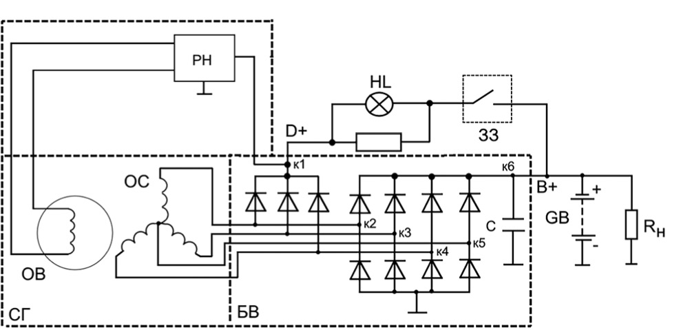 Генераторная установка имеет два контакта: D+ для подачи питания к обмотке возбуждения (ОВ) генератора через полупроводниковый регулятор напряжения (РН), ключ замка зажигания (ЗЗ) и контрольную лампу заряда (НL); контакт В+ служит для отдачи энергии на зарядку аккумуляторной батареи (GB) и питание потребителей Rн.
