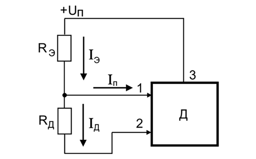 При использовании эталонного резистора напряжение питания Uп, подаваемое с вывода 3, диагностического устройства Д уравновешивается падением напряжения UЭ на эталонном резисторе и падением напряжения UД на диагностируемой катушке, т.е.