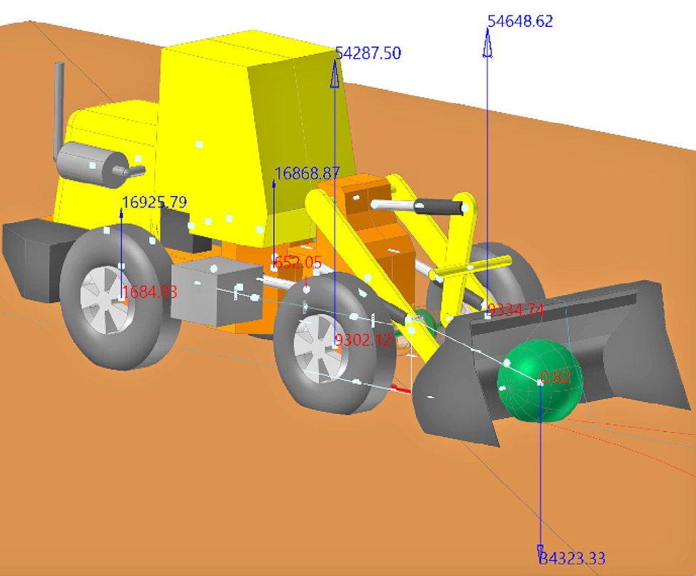 Общий вид динамической модели фронтального погрузчика с массой груза в ковше равной 3500 кг, разработанной в системе расчета динамики тел, представлен на рис. 1. Синими стрелками на изображениях показаны усилия в шарнирах или силовых связях, красными – моменты. Численные значения показывают величину силы в Н и момента в Н·м. На рис. 1 для примера показаны магнитуды реакций в пятне контакта колес с опорной поверхностью и вес груза в ковше.
