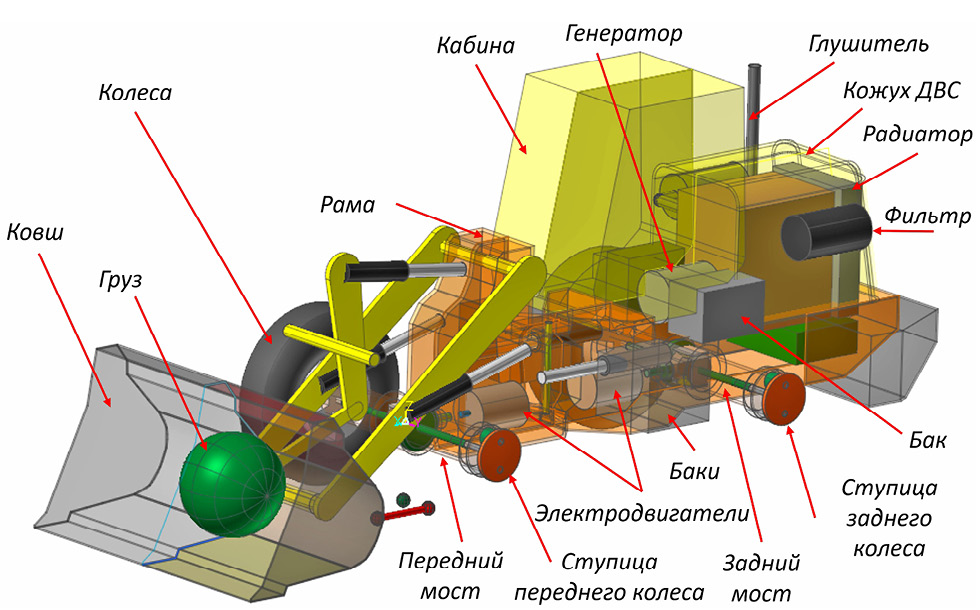 Рис. 2. Компоненты математической модели фронтального погрузчика.