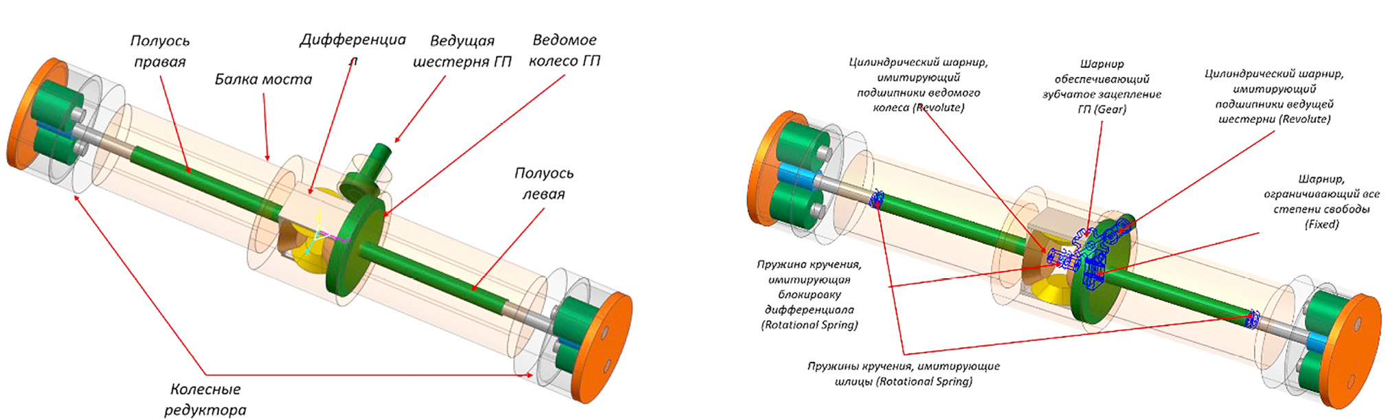 Общий вид модели ведущего моста со схемой размещения шарниров и силовых связей в модели фронтального погрузчика показан на рис. 3. Модели переднего и заднего мостов одинаковые. Задний мост повернут вокруг вертикальной оси ФП на 180 градусов. Звенья ведущего моста связаны между собой (рис. 3): шарнирами, ограничивающими все степени свободы (Fixed); пружинами кручения (Rotational Spring), имитирующими шлицы и блокировку дифференциала; цилиндрическими шарнирами, моделирующими подшипники (Revolute); шарнирами, моделирующими зубчатое зацепление ГП, дифференциала и колесного редуктора (Gear).
