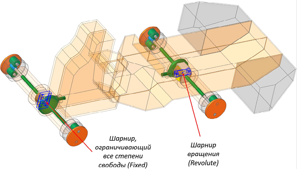 Рис. 3. Общий вид модели переднего моста со схемой размещения шарниров и силовых связей в модели фронтального погрузчика.