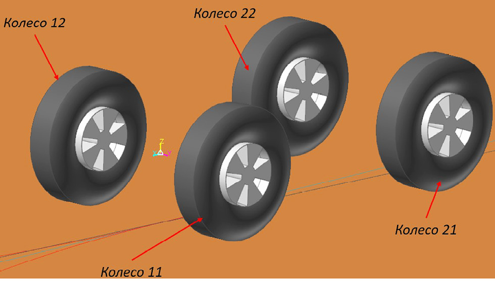 Общий вид модели колесного движителя представлен на рис. 5. Принята следующая нумерация звеньев, шарниров и силовых соединений: элементы, относящиеся к левому переднему движителю, имеют индекс 11; элементы, относящиеся к правому переднему движителю, – индекс 12; элементы, относящиеся к левому заднему движителю,– индекс 21; элементы, относящиеся к правому заднему движителю, – индекс 22. Шины размерностью 17.5–25, номинальной грузоподъемностью 50 000 Н. Масса одного колеса в сборе составляет 200 кг.