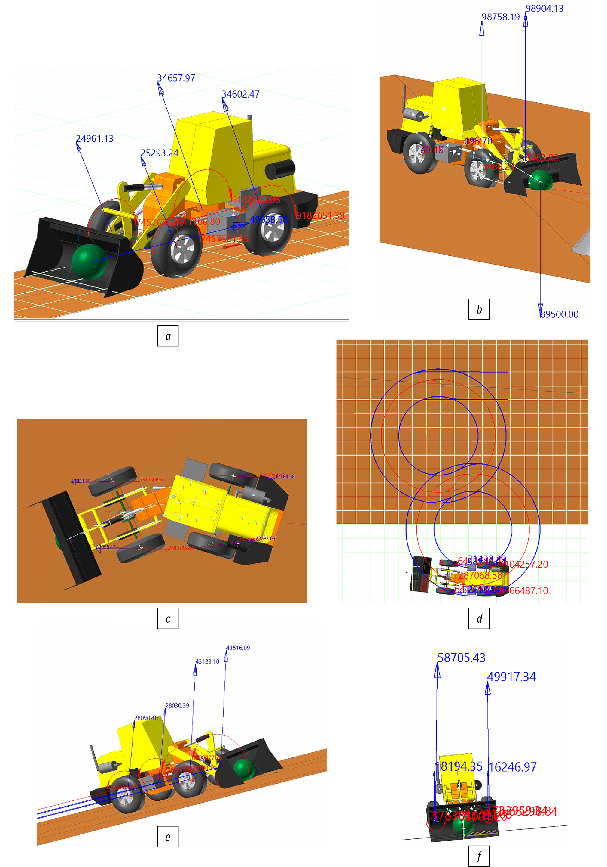 Примеры результатов по некоторым нагрузочным режимам приведены на рис. 8 (a – движение ФП в бульдозерном режиме; b – общий вид модели ФП при максимально сложенных рамах; c – определение опрокидывающего усилия; d – движение по кругу с минимальным радиусом поворота; e – движение на подъеме; f – расчет нормальных реакций на косогоре).