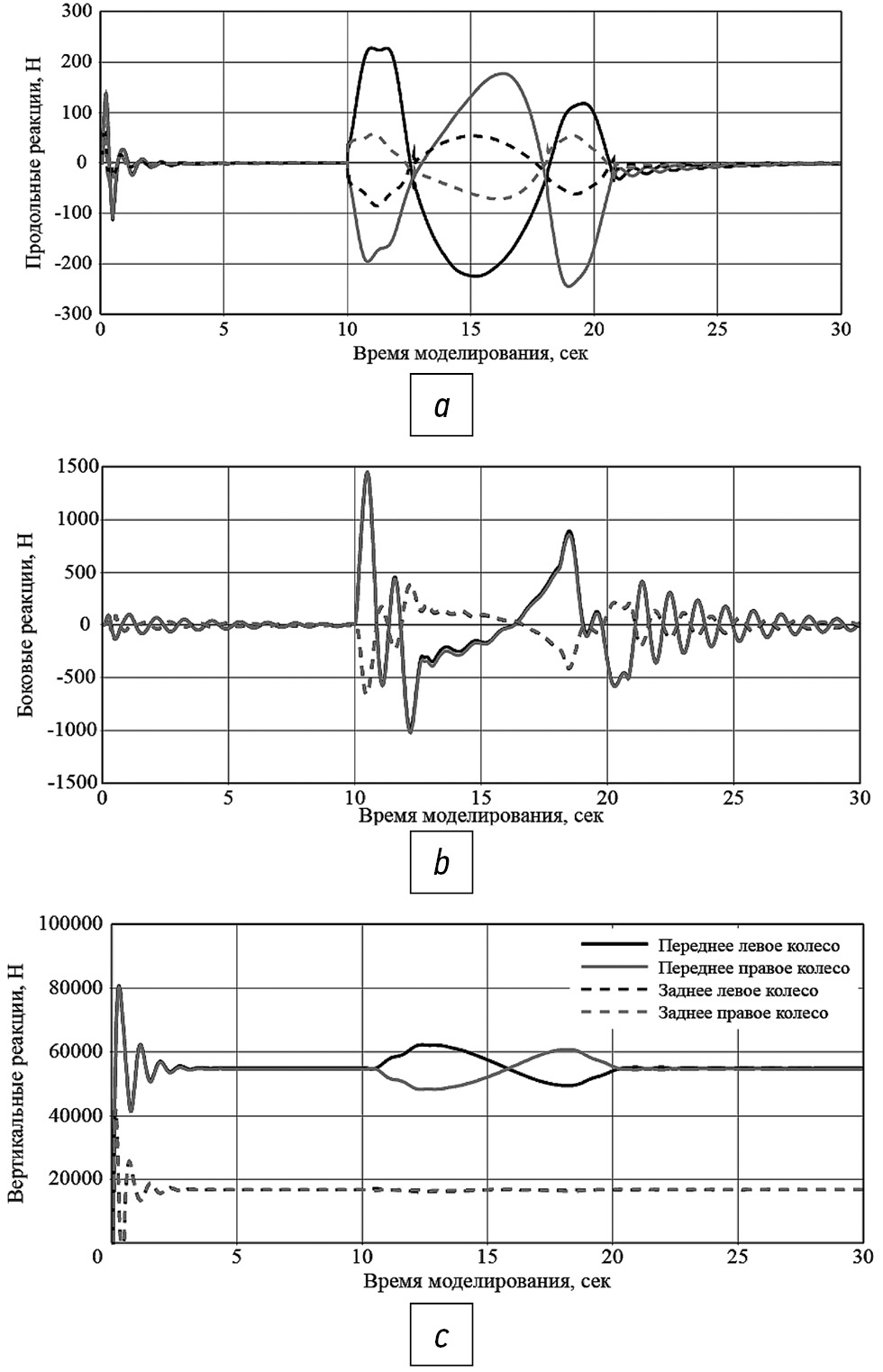Рис. 9. Изменение реакций в пятне контакта фронтального погрузчика при движении по неровной ОП: a – продольные реакции; b – поперечные реакции; c – вертикальные реакции.