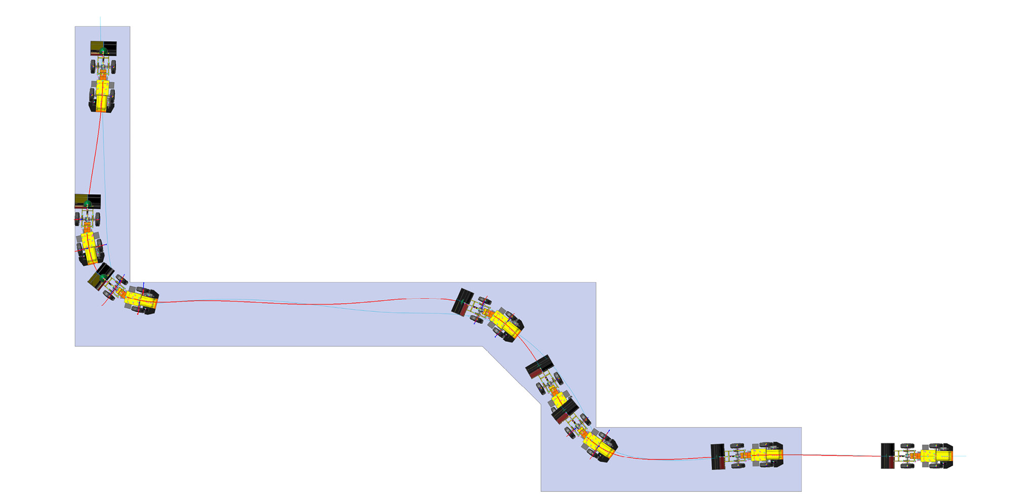 Также с помощью разработанной динамической модели производилась оценка работоспособности рулевого управления. Для этого был задан коридор [16], в котором должен был двигаться исследуемый ФП. В результате моделирования получена визуальная информация, о том, что ФП не вышел за границы заданного коридора (рис. 10), а также получены усилия в гидроцилиндрах рулевого управления, необходимые для поворота ФП. По этим усилиям подбираются гидроцилиндры рулевого управления.