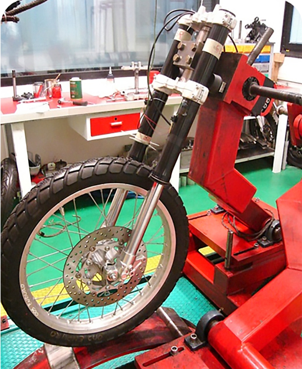 Специалисты известной фирмы Öhlins (Швеция), работающей в области проектирования и исследований подвесок мотоциклов и горных велосипедов, разработали методику испытаний вилки мотоцикла и балансирного рычага. Эти работы были выполнены на стенде с беговыми барабанами – Cam Drum. Величины нагружения рассчитываются исходя из геометрических размеров неровностей, установленных на барабанах, направлением их установки на барабанах и скоростью вращения самих барабанов. Передняя подвеска мотоцикла, установленная на стенде Cam Drum, изображена на рис. 2.