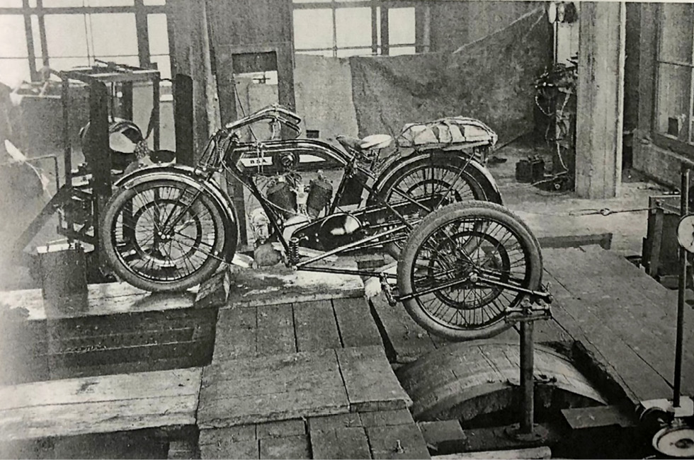 В настоящее время ведётся разработка и производство барабанного стенда для ресурсных испытаний мототехники. Этот стенд будет иметь модульную конструкцию, благодаря которой представляется возможным испытание как одиночных подвесок, так и комплектного мотоцикла в различных его конфигурациях. Следует отметить интересный факт, что «барабанный» стенд был создан в НАМИ в 1922 году (ровно 100 лет назад). Его отличительной чертой является то, что он был спроектирован для измерения тягово-скоростных свойств мотоцикла (рис. 4).