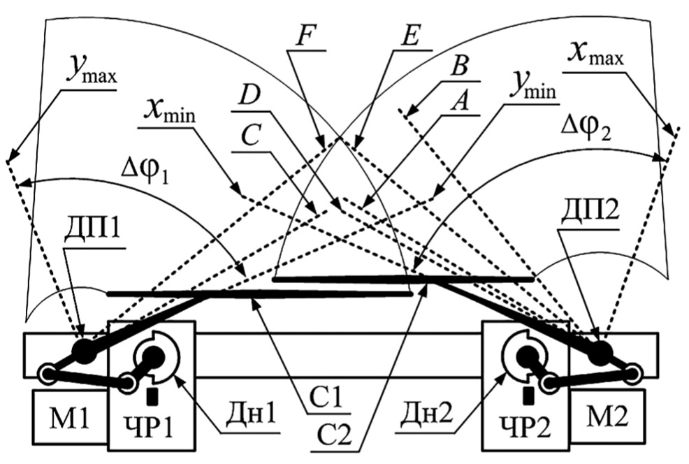 Если вращение валов электрических двигателей происходит в одном направлении с постоянной скоростью, то при таких кулисных передачах валы стеклоочистителей совершают реверсивное вращение с переменной скоростью по всей ширине зон Δφ1 и Δφ2. Червячные редукторы ЧР1 и ЧР2 предназначены для понижения скоростей вращения двигателей и повышения их моментов. На рис. 1 также показана зона возможного пересечения стеклоочистителей, образованная пересечением зон Δφ1 и Δφ2 и ограниченная их позициями E и F.