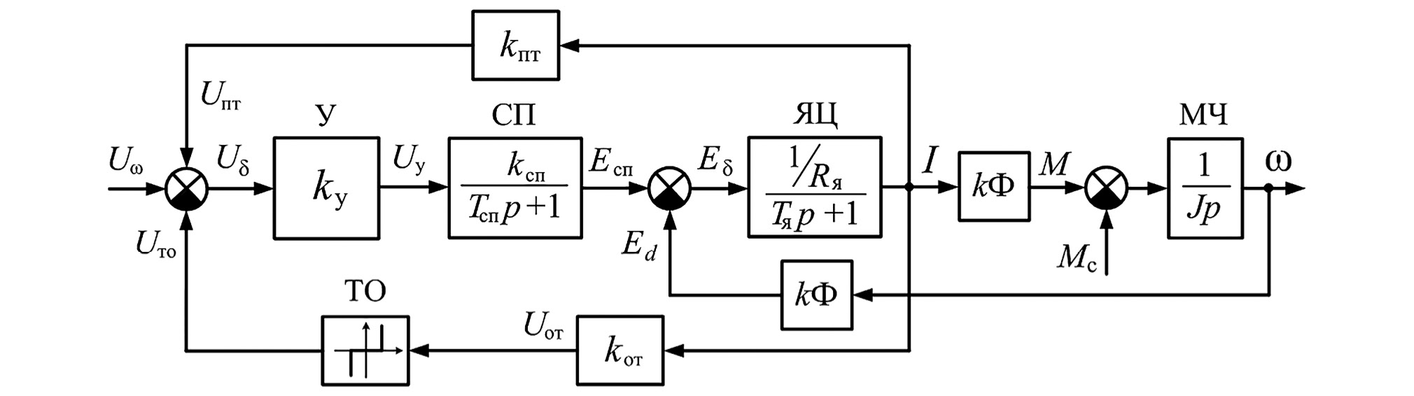 В этой схеме имеются следующие обозначения параметров электропривода и его координат: Uω – сигнал задания скорости вращения двигателя, Uпт и kпт – сигнал положительной обратной связи по току и ее коэффициент, Uот и kот – сигнал отрицательной обратной связи по току с токоограничением ТО по отсечке [7, 8] и ее коэффициент, Uδ – сигнал рассогласования, kу – коэффициент передачи суммирующего усилителя У, kсп и Tсп – коэффициент передачи и постоянная времени силового преобразователя СП, Eсп – ЭДС силового преобразователя, Ed – ЭДС вращения двигателя, Eδ – их разность, Rя и Tя – активное сопротивление якорной цепи ЯЦ двигателя и его электромагнитная постоянная времени с учетом параметров силового преобразователя, kФ – коэффициент двигателя при постоянном магнитном потоке Ф, J – момент инерции механической части МЧ, приведенный к валу двигателя с учетом момента инерции его ротора, I – ток якорной цепи, M – электромагнитный момент, Mс – момент нагрузки, ω – скорость вращения электрического двигателя, p – оператор Лапласа. Сигнал задания Uω и промежуточные координаты {U}, выше названные сигналами, при цифровой реализации системы управления являются эквивалентными им цифровыми кодами.
