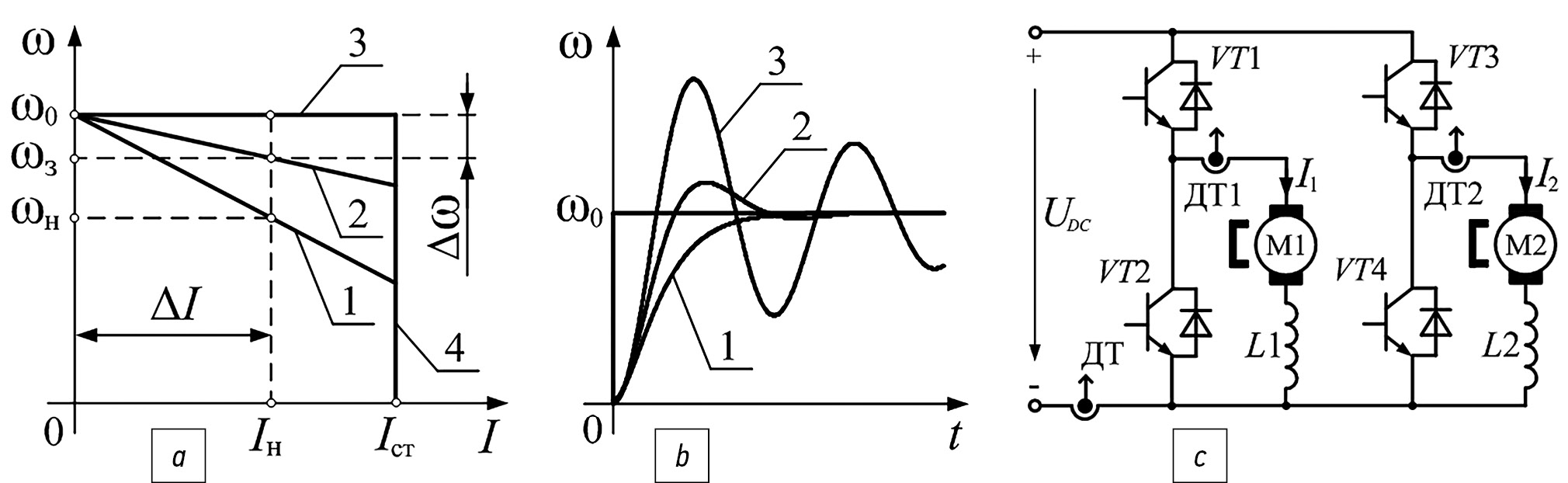 Рис. 3. Система управления электропривода: а – статические электромеханические характеристики; b – реакция на скачкообразный сигнал задания; c – схема силового преобразователя. / Fig. 3. Electric drive control system: а – static electromechanical properties; b – response to a jump input signal; c – the scheme of the power converter.