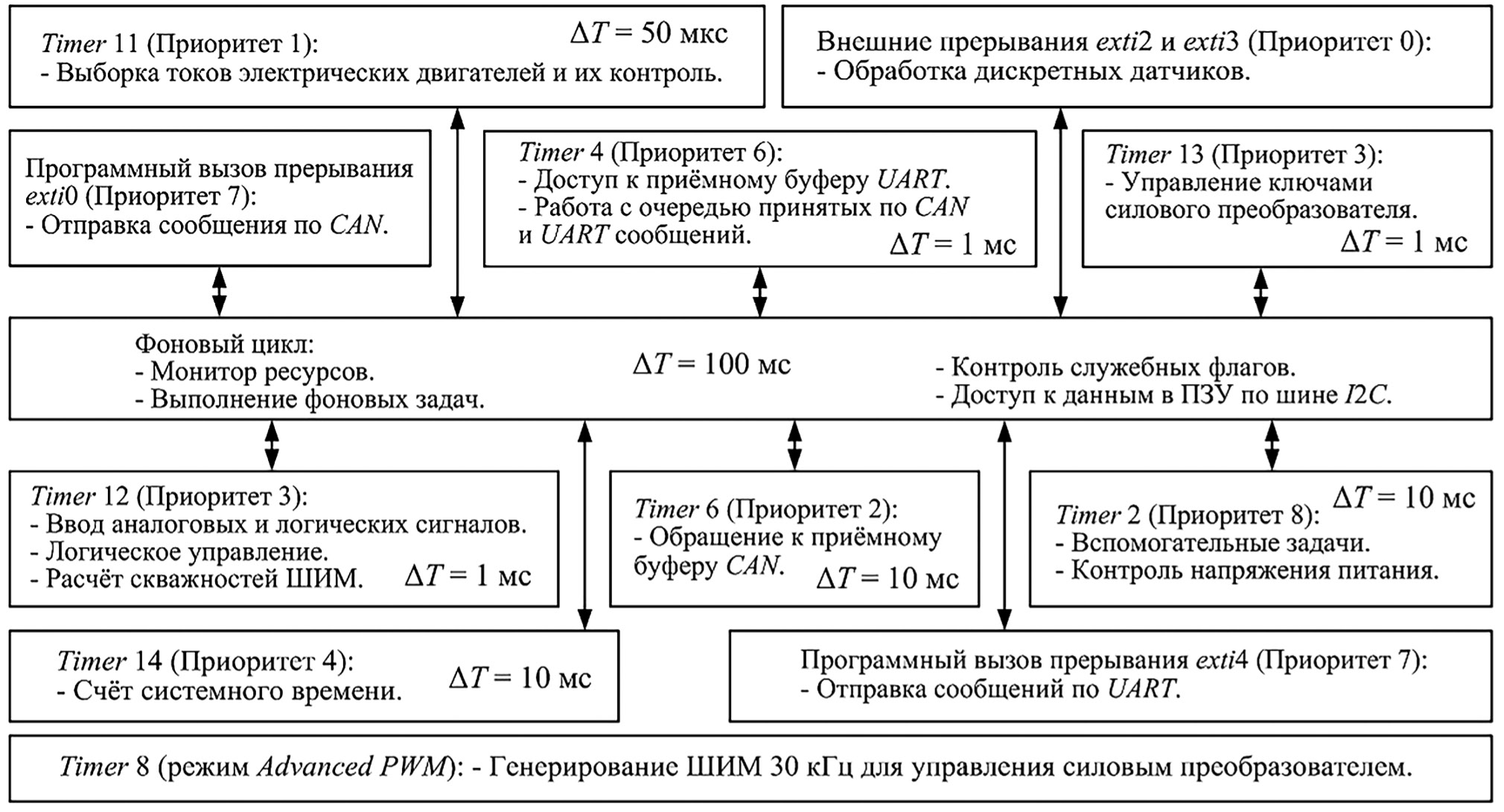 Разработка программного обеспечения для микропроцессорного управления потребовала учета ограниченности вычислительных ресурсов микроконтроллера. Согласно блок-схеме на рис. 4 задачам управления назначены приоритеты и интервалы повторения ΔT, исходя из их значимости и своевременного захвата, обработки и генерирования сигналов. При этом более высоким приоритетам соответствуют меньшие их номера, указанные на рис. 4.