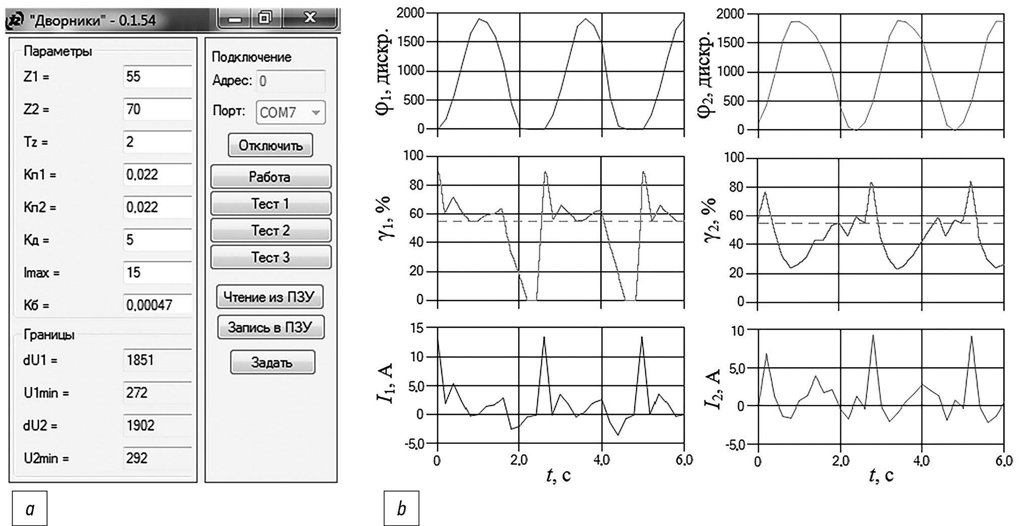 Рис. 6. Система управления электропривода: а – панель приложения для настройки с помощью персонального компьютера; b – экспериментальные графики координат. / Fig. 6. The electric drive control system: а – the toolbar of the application for tuning with use of a personal computer; b – the experimental graphs of coordinates.